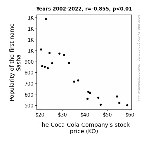 This means 73% of the change in the one variable (i.e., The Coca-Cola Company's stock price (KO)) is predictable based on the change in the other (i.e., Popularity of the first name Sasha) over the 21 years from 2002 through 2022.