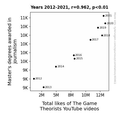 This means 92.6% of the change in the one variable (i.e., Total likes of The Game Theorists YouTube videos) is predictable based on the change in the other (i.e., Master's degrees awarded in journalism) over the 10 years from 2012 through 2021.