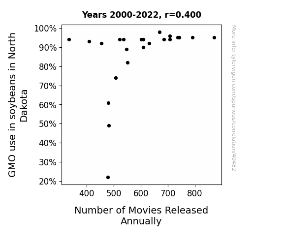 This means 16% of the change in the one variable (i.e., Number of Movies Released Annually) is predictable based on the change in the other (i.e., GMO use in soybeans in North Dakota) over the 23 years from 2000 through 2022.