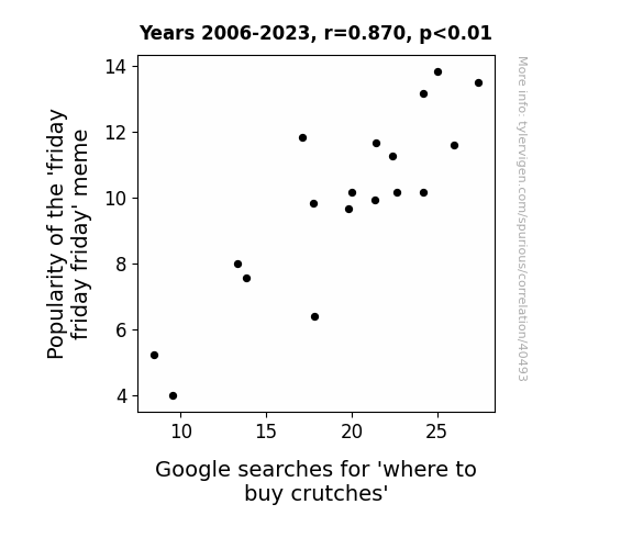 This means 75.7% of the change in the one variable (i.e., Google searches for 'where to buy crutches') is predictable based on the change in the other (i.e., Popularity of the 'friday friday friday' meme) over the 18 years from 2006 through 2023.