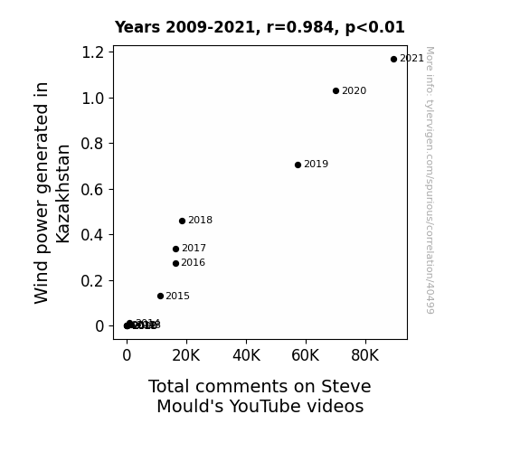 This means 96.8% of the change in the one variable (i.e., Total comments on Steve Mould's YouTube videos) is predictable based on the change in the other (i.e., Wind power generated in Kazakhstan) over the 13 years from 2009 through 2021.