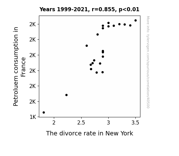 This means 73.1% of the change in the one variable (i.e., The divorce rate in New York) is predictable based on the change in the other (i.e., Petroluem consumption in France) over the 23 years from 1999 through 2021.