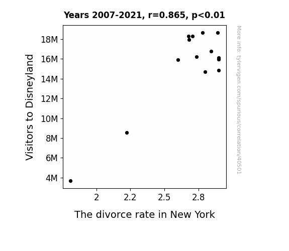 This means 74.9% of the change in the one variable (i.e., The divorce rate in New York) is predictable based on the change in the other (i.e., Visitors to Disneyland) over the 15 years from 2007 through 2021.