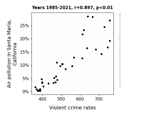 This means 80.4% of the change in the one variable (i.e., Violent crime rates) is predictable based on the change in the other (i.e., Air pollution in Santa Maria, California) over the 37 years from 1985 through 2021.