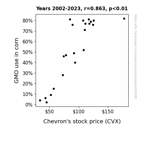 This means 74.5% of the change in the one variable (i.e., Chevron's stock price (CVX)) is predictable based on the change in the other (i.e., GMO use in corn) over the 22 years from 2002 through 2023.