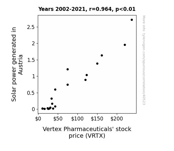 This means 92.9% of the change in the one variable (i.e., Vertex Pharmaceuticals' stock price (VRTX)) is predictable based on the change in the other (i.e., Solar power generated in Austria) over the 20 years from 2002 through 2021.