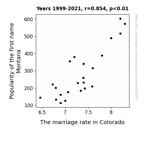 This means 72.9% of the change in the one variable (i.e., The marriage rate in Colorado) is predictable based on the change in the other (i.e., Popularity of the first name Montana) over the 23 years from 1999 through 2021.