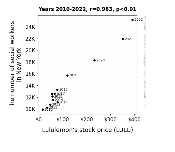 This means 96.7% of the change in the one variable (i.e., Lululemon's stock price (LULU)) is predictable based on the change in the other (i.e., The number of social workers in New York) over the 13 years from 2010 through 2022.