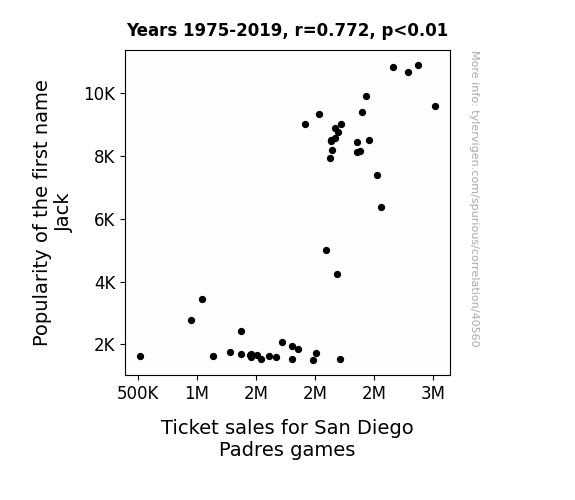 This means 59.6% of the change in the one variable (i.e., Ticket sales for San Diego Padres games) is predictable based on the change in the other (i.e., Popularity of the first name Jack) over the 45 years from 1975 through 2019.
