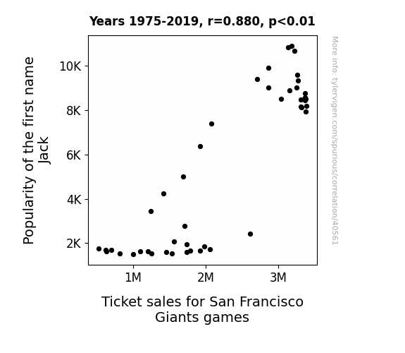 This means 77.5% of the change in the one variable (i.e., Ticket sales for San Francisco Giants games) is predictable based on the change in the other (i.e., Popularity of the first name Jack) over the 45 years from 1975 through 2019.