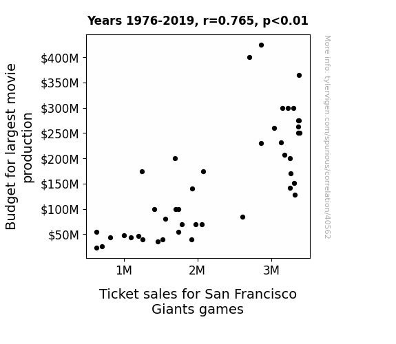 This means 58.5% of the change in the one variable (i.e., Ticket sales for San Francisco Giants games) is predictable based on the change in the other (i.e., Budget for largest movie production) over the 44 years from 1976 through 2019.