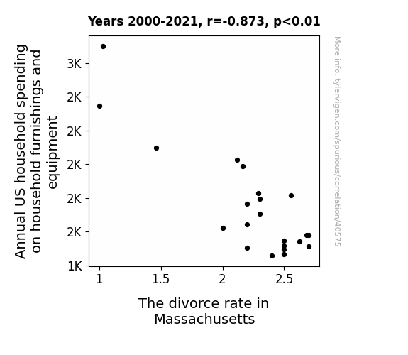 This means 76.1% of the change in the one variable (i.e., The divorce rate in Massachusetts) is predictable based on the change in the other (i.e., Annual US household spending on household furnishings and equipment) over the 22 years from 2000 through 2021.