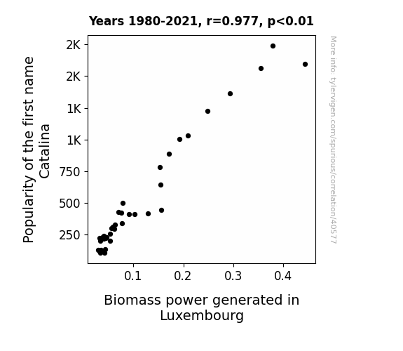 This means 95.4% of the change in the one variable (i.e., Biomass power generated in Luxembourg) is predictable based on the change in the other (i.e., Popularity of the first name Catalina) over the 42 years from 1980 through 2021.