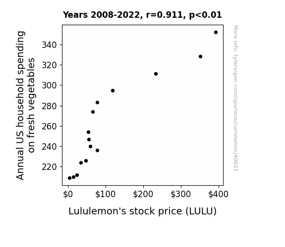 This means 83.1% of the change in the one variable (i.e., Lululemon's stock price (LULU)) is predictable based on the change in the other (i.e., Annual US household spending on fresh vegetables) over the 15 years from 2008 through 2022.