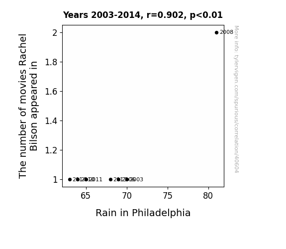 This means 81.3% of the change in the one variable (i.e., Rain in Philadelphia) is predictable based on the change in the other (i.e., The number of movies Rachel Bilson appeared in) over the 7 years from 2003 through 2014.