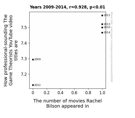 This means 86.1% of the change in the one variable (i.e., The number of movies Rachel Bilson appeared in) is predictable based on the change in the other (i.e., How professional-sounding The Game Theorists YouTube video titles are) over the 6 years from 2009 through 2014.