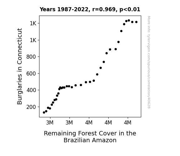 This means 93.8% of the change in the one variable (i.e., Remaining Forest Cover in the Brazilian Amazon) is predictable based on the change in the other (i.e., Burglaries in Connecticut) over the 36 years from 1987 through 2022.