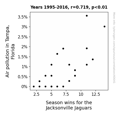 This means 51.6% of the change in the one variable (i.e., Season wins for the Jacksonville Jaguars) is predictable based on the change in the other (i.e., Air pollution in Tampa, Florida) over the 22 years from 1995 through 2016.