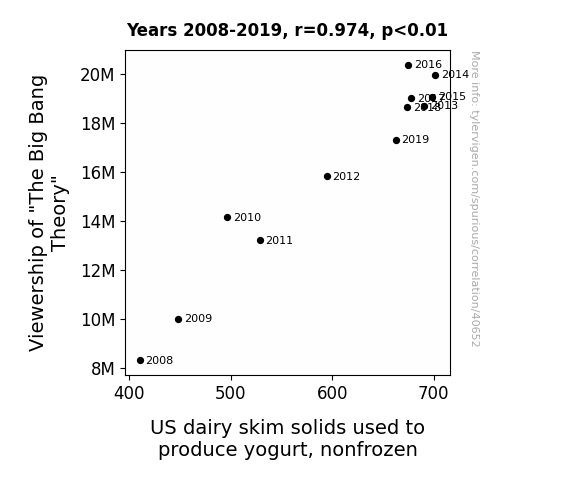 This means 94.9% of the change in the one variable (i.e., US dairy skim solids used to produce yogurt, nonfrozen) is predictable based on the change in the other (i.e., Viewership of "The Big Bang Theory") over the 12 years from 2008 through 2019.