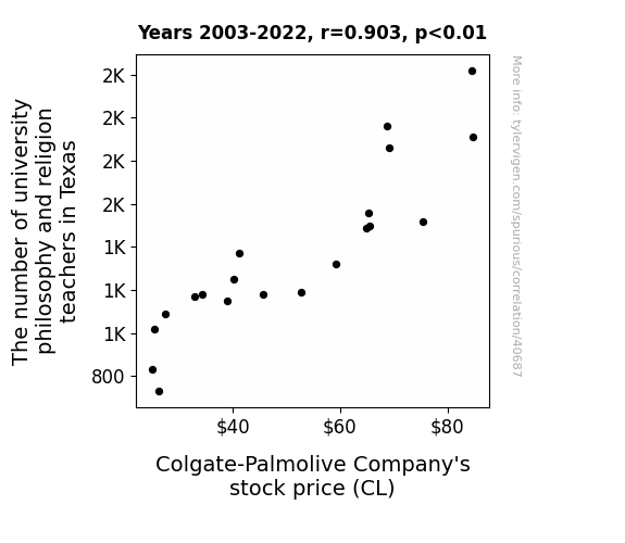 This means 81.6% of the change in the one variable (i.e., Colgate-Palmolive Company's stock price (CL)) is predictable based on the change in the other (i.e., The number of university philosophy and religion teachers in Texas) over the 20 years from 2003 through 2022.