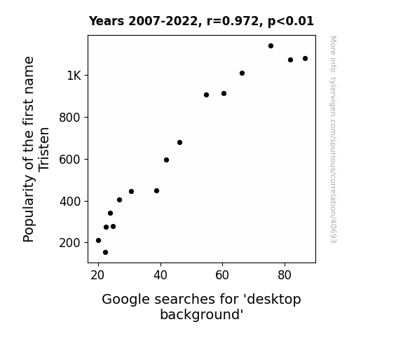 This means 94.4% of the change in the one variable (i.e., Google searches for 'desktop background') is predictable based on the change in the other (i.e., Popularity of the first name Tristen) over the 16 years from 2007 through 2022.