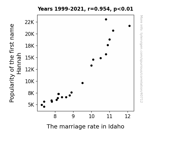 This means 91.1% of the change in the one variable (i.e., The marriage rate in Idaho) is predictable based on the change in the other (i.e., Popularity of the first name Hannah) over the 23 years from 1999 through 2021.