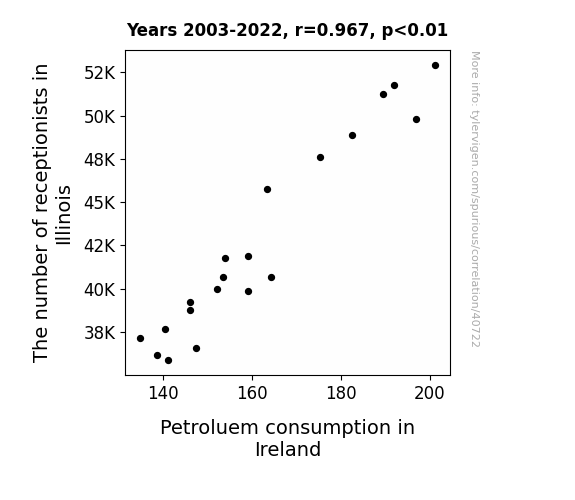 This means 93.4% of the change in the one variable (i.e., Petroluem consumption in Ireland) is predictable based on the change in the other (i.e., The number of receptionists in Illinois) over the 20 years from 2003 through 2022.