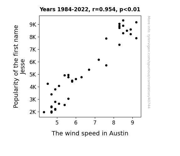 This means 91% of the change in the one variable (i.e., The wind speed in Austin) is predictable based on the change in the other (i.e., Popularity of the first name Jesse) over the 39 years from 1984 through 2022.