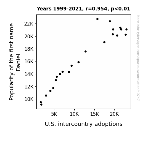 This means 91% of the change in the one variable (i.e., U.S. intercountry adoptions) is predictable based on the change in the other (i.e., Popularity of the first name Daniel) over the 23 years from 1999 through 2021.