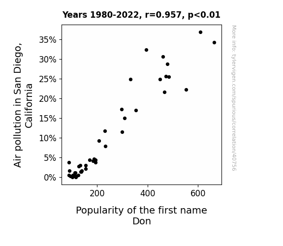 This means 91.7% of the change in the one variable (i.e., Popularity of the first name Don) is predictable based on the change in the other (i.e., Air pollution in San Diego, California) over the 43 years from 1980 through 2022.