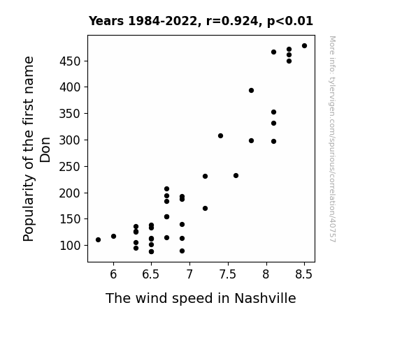 This means 85.5% of the change in the one variable (i.e., The wind speed in Nashville) is predictable based on the change in the other (i.e., Popularity of the first name Don) over the 39 years from 1984 through 2022.