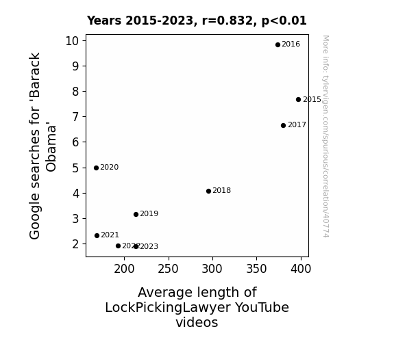 This means 69.3% of the change in the one variable (i.e., Average length of LockPickingLawyer YouTube videos) is predictable based on the change in the other (i.e., Google searches for 'Barack Obama') over the 9 years from 2015 through 2023.