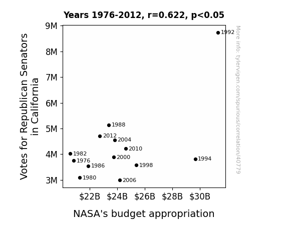 This means 38.7% of the change in the one variable (i.e., NASA's budget appropriation) is predictable based on the change in the other (i.e., Votes for Republican Senators in California) over the 13 years from 1976 through 2012.