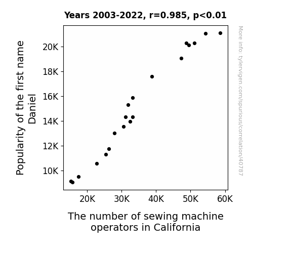 This means 97.1% of the change in the one variable (i.e., The number of sewing machine operators in California) is predictable based on the change in the other (i.e., Popularity of the first name Daniel) over the 20 years from 2003 through 2022.
