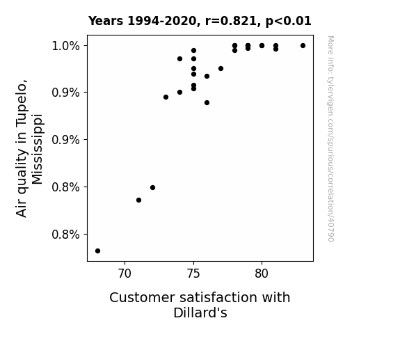 This means 67.4% of the change in the one variable (i.e., Customer satisfaction with Dillard's) is predictable based on the change in the other (i.e., Air quality in Tupelo, Mississippi) over the 27 years from 1994 through 2020.