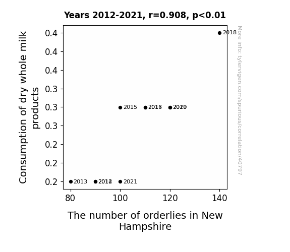 This means 82.5% of the change in the one variable (i.e., The number of orderlies in New Hampshire) is predictable based on the change in the other (i.e., Consumption of dry whole milk products) over the 10 years from 2012 through 2021.