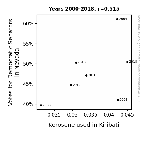 This means 26.5% of the change in the one variable (i.e., Kerosene used in Kiribati) is predictable based on the change in the other (i.e., Votes for Democratic Senators in Nevada) over the 7 years from 2000 through 2018.