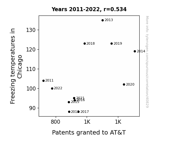 This means 28.5% of the change in the one variable (i.e., Patents granted to AT&T) is predictable based on the change in the other (i.e., Freezing temperatures in Chicago) over the 12 years from 2011 through 2022.