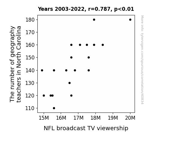 This means 61.9% of the change in the one variable (i.e., NFL broadcast TV viewership) is predictable based on the change in the other (i.e., The number of geography teachers in North Carolina) over the 20 years from 2003 through 2022.