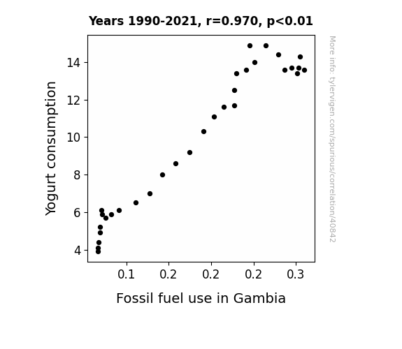 This means 94.1% of the change in the one variable (i.e., Fossil fuel use in Gambia) is predictable based on the change in the other (i.e., Yogurt consumption) over the 32 years from 1990 through 2021.