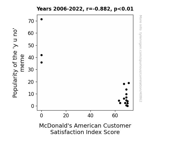 This means 77.8% of the change in the one variable (i.e., McDonald's American Customer Satisfaction Index Score) is predictable based on the change in the other (i.e., Popularity of the 'y u no' meme) over the 17 years from 2006 through 2022.