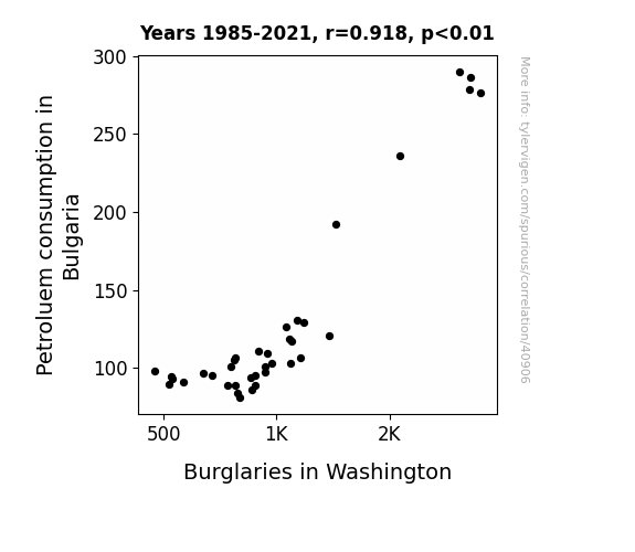 This means 84.3% of the change in the one variable (i.e., Burglaries in Washington) is predictable based on the change in the other (i.e., Petroluem consumption in Bulgaria) over the 37 years from 1985 through 2021.