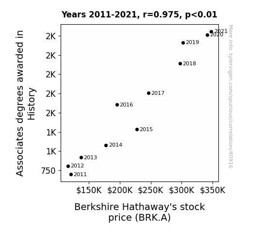 This means 95.1% of the change in the one variable (i.e., Berkshire Hathaway's stock price (BRK.A)) is predictable based on the change in the other (i.e., Associates degrees awarded in History) over the 11 years from 2011 through 2021.