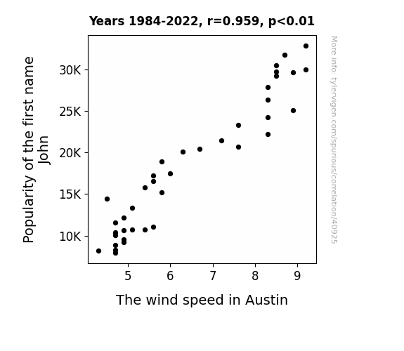 This means 91.9% of the change in the one variable (i.e., The wind speed in Austin) is predictable based on the change in the other (i.e., Popularity of the first name John) over the 39 years from 1984 through 2022.