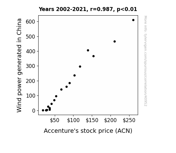 This means 97.5% of the change in the one variable (i.e., Accenture's stock price (ACN)) is predictable based on the change in the other (i.e., Wind power generated in China) over the 20 years from 2002 through 2021.