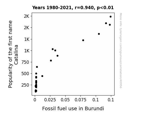 This means 88.4% of the change in the one variable (i.e., Fossil fuel use in Burundi) is predictable based on the change in the other (i.e., Popularity of the first name Catalina) over the 42 years from 1980 through 2021.