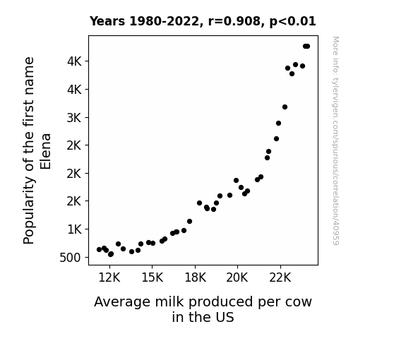 This means 82.4% of the change in the one variable (i.e., Average milk produced per cow in the US) is predictable based on the change in the other (i.e., Popularity of the first name Elena) over the 43 years from 1980 through 2022.