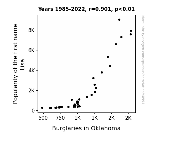 This means 81.2% of the change in the one variable (i.e., Burglaries in Oklahoma) is predictable based on the change in the other (i.e., Popularity of the first name Lisa) over the 38 years from 1985 through 2022.