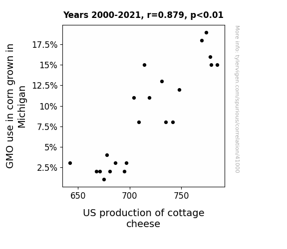 This means 77.3% of the change in the one variable (i.e., US production of cottage cheese) is predictable based on the change in the other (i.e., GMO use in corn grown in Michigan) over the 22 years from 2000 through 2021.