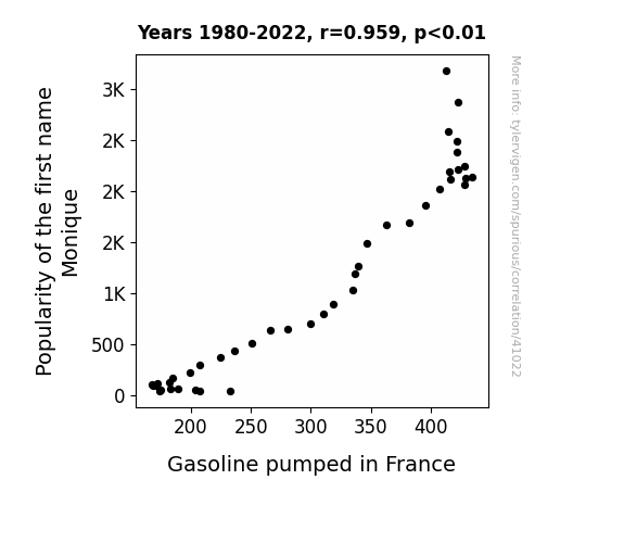 This means 92% of the change in the one variable (i.e., Gasoline pumped in France) is predictable based on the change in the other (i.e., Popularity of the first name Monique) over the 43 years from 1980 through 2022.